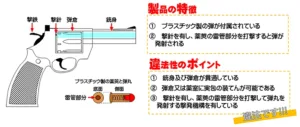 しかし、モデルガンの構造をベースに設計されていたため、撃針がプライマーを直接打撃できる構造になっていました。その結果、実弾を発射できる可能性があり、安全性が著しく不十分であると警察当局から判断されています。