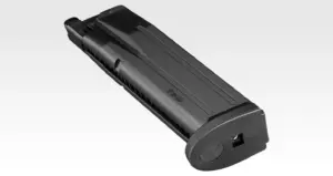 東京マルイ P320 フルサイズには、亜鉛ダイキャスト製の専用マガジン(装弾数26発)が標準で付属します。このマガジンは冷えに強いダイキャスト製で、万が一冷えてしまっても簡単に温めやすいという利点があります。