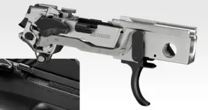 東京マルイのP320は、実銃と同様にトリガー、シア、ハンマーといったパーツを一体化させて再現。フレーム(グリップ)から独立して動作するのも特徴です。これにより、メンテナンス性が向上し、実銃同様のギミックも楽しめます。